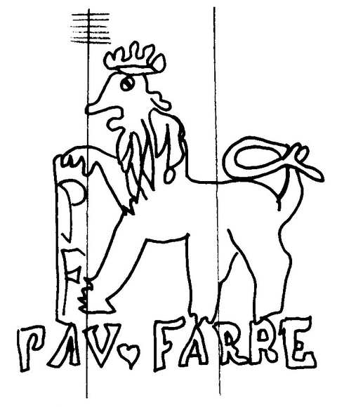 Tipo de filigrana: Sencilla Parte estudiada: Toda la filigrana Código del Motivo: C.04.02.00 Descripción: León coronado que apoya su pata delantera derecha sobre una especie de columna formada por las iniciales PF; en los pies la palabra PAV, pequeño corazón, FARRE. Estructura: Tradicional de líneas Altura (mm): 61 Anchura (mm): 55 Tipo de papel: Verjurado Posición en la hoja: Distancia entre corondeles: Posición en relación al texto: Origen de los datos: Datos obtenidos de una repro Información adicional: Esta filigrana ha sido publicada por Oriol VALLS i SUBIRÁ, Paper and Watermarks in Catalonia. T. I-II. Amsterdam: The Paper Publications Society, 1970, filigrana nº 389. La imagen que se ofrece es un calco manual de la filigrana publicada y parte de los País de localizatión del molino: España Lugar del molino: Cardona, Barcelona, Cataluña Fabricante: Pau Ferrer. Estado de la hoja: Altura de la hoja: Anchura de la hoja: Color de la hoja: Institución: Archivo Municipal de Manresa, Barcelona.