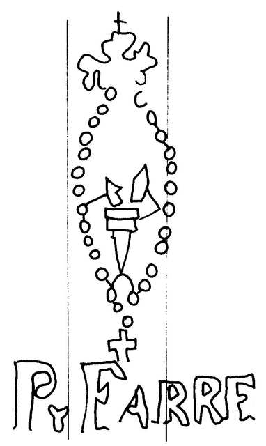 Tipo de filigrana: Sencilla Parte estudiada: Toda la filigrana Código del Motivo: N.11.02.00 Descripción: Rosario; en el interior un yunque y a los pies la palabra P FARRE. Estructura: Tradicional de líneas Altura (mm): 100 Anchura (mm): 57 Tipo de papel: Verjurado Posición en la hoja: Distancia entre corondeles: Posición en relación al texto: Origen de los datos: Datos obtenidos de una repro Información adicional: Esta filigrana ha sido publicada por Oriol VALLS i SUBIRÁ, Paper and Watermarks in Catalonia. T. I-II. Amsterdam: The Paper Publications Society, 1970, filigrana nº 391. La imagen que se ofrece es un calco manual de la filigrana publicada y parte de los País de localizatión del molino: España Lugar del molino: Cardona, Barcelona, Cataluña Fabricante: Pau Ferrer. Estado de la hoja: Altura de la hoja: Anchura de la hoja: Color de la hoja: Institución: Archivo del Museo-Molino Papelero, Capellades, Barcelona.