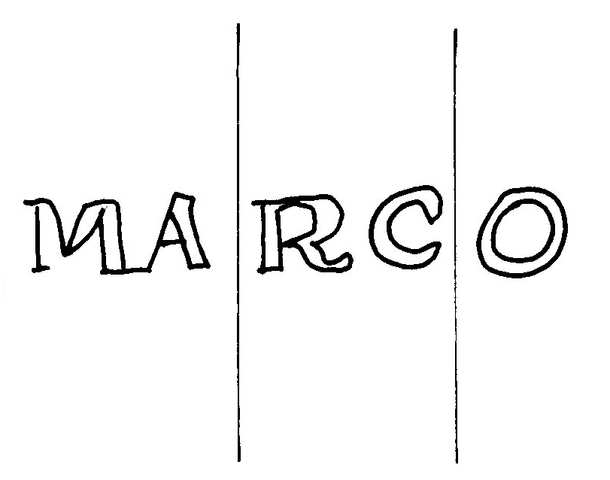 Tipo de filigrana: Doble Parte estudiada: Izquierda Código del Motivo: W.01.00.00 Descripción: Filigrana doble. Filigrana izquierda: la palabra MARCO. Filigrana derecha: escudo con barras cargadas de flor de Lis y olas del mar. Estructura: Tradicional de líneas Altura (mm): 9 Anchura (mm): 61 Tipo de papel: Verjurado Posición en la hoja: Distancia entre corondeles: Posición en relación al texto: Origen de los datos: Datos obtenidos de una repro Información adicional: GAYOSO, G. Historia del Papel en España. T. I-III. Lugo: Diputación Provincial, 1994, filigrana nº 91. La imagen que se ofrece es un calco manual de la filigrana publicada y parte de los datos son resultado de su estudio. País de localizatión del molino: España Lugar del molino: Ibeas de Juarros, Burgos. Fabricante: Marco. Estado de la hoja: Altura de la hoja: Anchura de la hoja: Color de la hoja: País de uso del papel: España