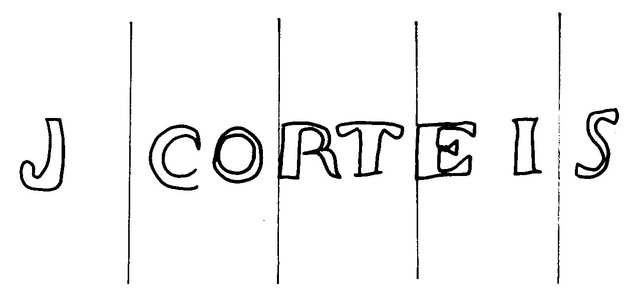 Tipo de filigrana: Doble Parte estudiada: Izquierda Código del Motivo: W.04.02.00 Descripción: Filigrana doble. Filigrana izquierda: J CORTEIS. Filigrana derecha: escudo; en la base CALMARZA. Estructura: Tradicional de líneas Altura (mm): 12 Anchura (mm): 102 Tipo de papel: Verjurado Posición en la hoja: Distancia entre corondeles: Posición en relación al texto: Origen de los datos: Datos obtenidos de una repro Información adicional: GAYOSO, G. Historia del Papel en España. T. I-III. Lugo: Diputación Provincial, 1994, filigrana nº 16. La imagen que se ofrece es un calco manual de la filigrana publicada y parte de los datos son resultado de su estudio. País de localizatión del molino: España Lugar del molino: Calamarza, Zaragoza. Fabricante: Cortés. Estado de la hoja: Altura de la hoja: Anchura de la hoja: Color de la hoja: País de uso del papel: España