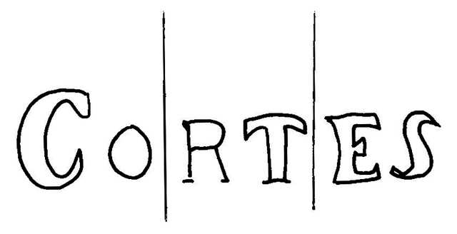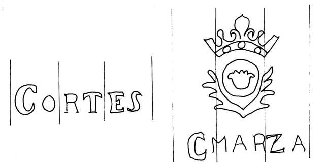 Tipo de filigrana: Doble Parte estudiada: Izquierda Código del Motivo: W.02.01.00 Descripción: Filigrana doble. Filigrana izquierda: CORTES. Filigrana derecha: escudo; en la base CMARZA. Estructura: Tradicional de líneas Altura (mm): 16 Anchura (mm): 67 Tipo de papel: Verjurado Posición en la hoja: Distancia entre corondeles: Posición en relación al texto: Origen de los datos: Datos obtenidos de una repro Información adicional: GAYOSO, G. Historia del Papel en España. T. I-III. Lugo: Diputación Provincial, 1994, filigrana nº 17. La imagen que se ofrece es un calco manual de la filigrana publicada y parte de los datos son resultado de su estudio. País de localizatión del molino: España Lugar del molino: Calamarza, Zaragoza. Fabricante: Cortés. Estado de la hoja: Altura de la hoja: Anchura de la hoja: Color de la hoja: País de uso del papel: España