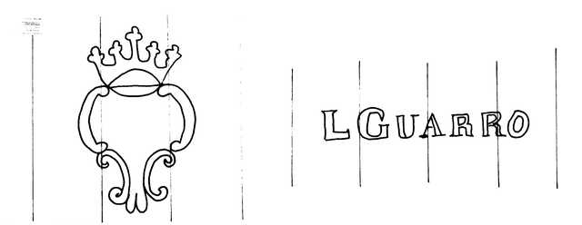 Tipo de filigrana: Doble Parte estudiada: Derecha Código del Motivo: W.04.02.00 Descripción: Filigrana doble. Filigrana izquierda: escudo con corona. Filigrana derecha: L GUARRO. Estructura: Tradicional de líneas Altura (mm): 10 Anchura (mm): 73 Tipo de papel: Verjurado Posición en la hoja: Distancia entre corondeles: Posición en relación al texto: Origen de los datos: Datos obtenidos de una repro Información adicional: GAYOSO, G. Historia del Papel en España. T. I-III. Lugo: Diputación Provincial, 1994, filigrana nº 177. La imagen que se ofrece es un calco manual de la filigrana publicada y parte de los datos son resultado de su estudio. País de localizatión del molino: España Lugar del molino: Cataluña Fabricante: Guarro. Estado de la hoja: Altura de la hoja: Anchura de la hoja: Color de la hoja: País de uso del papel: España