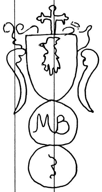 Tipo de filigrana: Sencilla Parte estudiada: Toda la filigrana Código del Motivo: U.02.02.08 Descripción: Dos círculos. Encima del primero un escudo surmontado por una cruz latina lobulada y el en interior un ave indeterminada. En el interior del primer círculo las letras MB y en el del segundo un signo indeterminado Estructura: Tradicional de líneas Altura (mm): 85 Anchura (mm): 46 Tipo de papel: Verjurado Posición en la hoja: Medio centro Distancia entre corondeles: Posición en relación al texto: Origen de los datos: Datos obtenidos del original Autor de los datos de este registro: María Dolores Díaz de Miranda Macías Estado de la hoja: Cortados todos los bordes Altura de la hoja: 310 Anchura de la hoja: 210 Color de la hoja: Natural Institución: Archivo Municipal de Oviedo.