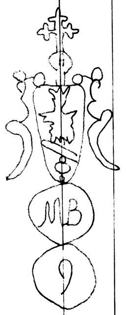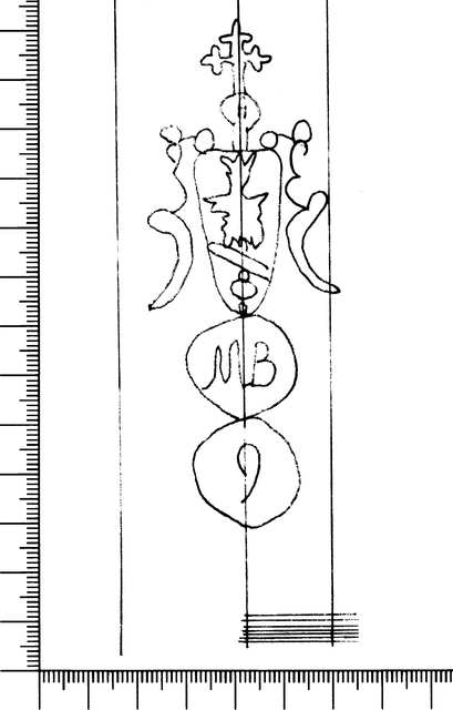 Tipo de filigrana: Sencilla Parte estudiada: Toda la filigrana Código del Motivo: U.02.02.08 Descripción: Dos círculos. Encima del primero un escudo partido surmontado por una cruz latina lobulada y el en interior un ave indeterminada. En el interior del primer círculo las letras MB y en el del segundo un signo indeterminadio Estructura: Tradicional de líneas Altura (mm): 104 Anchura (mm): 40 Tipo de papel: Verjurado Posición en la hoja: Medio centro Distancia entre corondeles: Posición en relación al texto: Origen de los datos: Datos obtenidos del original Autor de los datos de este registro: María Dolores Díaz de Miranda Macías Estado de la hoja: Cortados todos los bordes Altura de la hoja: 305 Anchura de la hoja: 204 Color de la hoja: Natural Institución: Archivo Municipal de Oviedo.