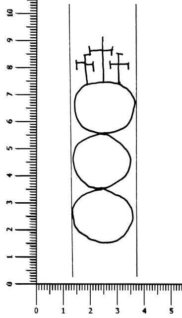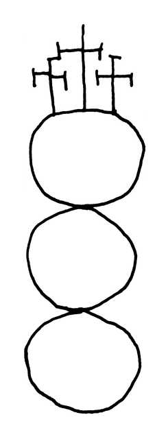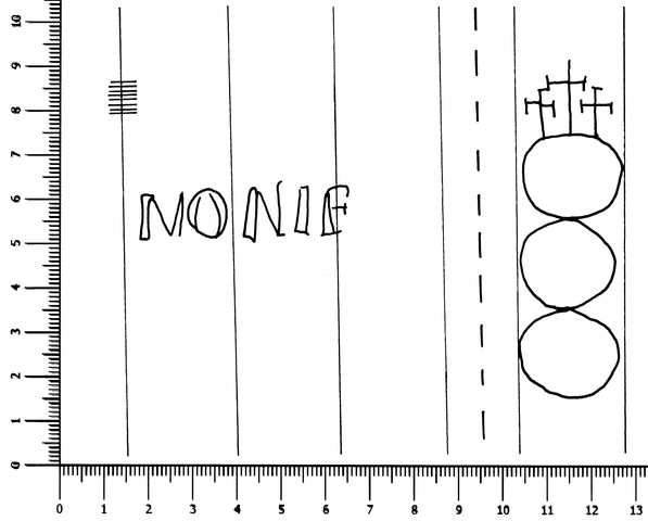 Tipo de filigrana: Doble Parte estudiada: Derecha Código del Motivo: U.03.03.03 Descripción: Filigranan doble. Filigrana izquierda: MONIE. Filigrana derecha: tres círculos surmontados por tres cruces, calvario. Estructura: Tradicional de líneas Altura (mm): 77 Anchura (mm): 23 Tipo de papel: Verjurado Posición en la hoja: Derecha centro Distancia entre corondeles: Posición en relación al texto: Origen de los datos: Datos obtenidos del original País de localizatión del molino: Francia Lugar del molino: Bigorre Fabricante: Monie Tipo de uso: Papel para escribir Estado de la hoja: Cortados todos los bordes Altura de la hoja: 296 Anchura de la hoja: 406 Color de la hoja: Natural Institución: Archivo Municipal de Avilés.
