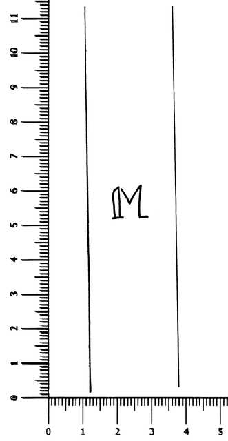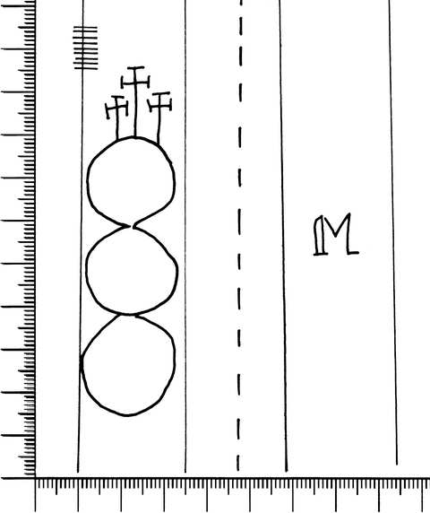 Tipo de filigrana: Doble Parte estudiada: Derecha Código del Motivo: V.01.13.00 Descripción: Filigrana doble. Filigrana izquierda: tres círculos surmontados por tres cruces, calvario. Filigrana derecha: inicial M. Estructura: Tradicional de líneas Altura (mm): 10 Anchura (mm): 11 Tipo de papel: Verjurado Posición en la hoja: Derecha centro Distancia entre corondeles: Posición en relación al texto: Origen de los datos: Datos obtenidos del original País de localizatión del molino: Francia Fabricante: Monie Tipo de uso: Papel para escribir Estado de la hoja: Cortados todos los bordes Altura de la hoja: 295 Anchura de la hoja: 403 Color de la hoja: Natural Institución: Archivo Municipal de Avilés.
