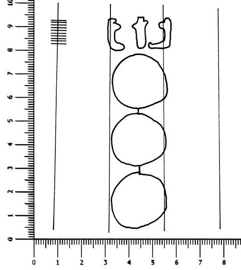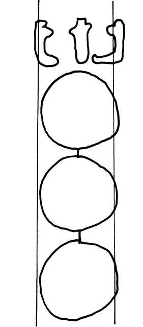 Tipo de filigrana: Sencilla Parte estudiada: Toda la filigrana Código del Motivo: U.03.03.06 Descripción: Tres círculos surmontados por una especie de corona. Estructura: Tradicional de líneas Altura (mm): 90 Anchura (mm): 47 Tipo de papel: Posición en la hoja: Indeterminada Distancia entre corondeles: Posición en relación al texto: Origen de los datos: Datos obtenidos del original País de localizatión del molino: Francia ? Estado de la hoja: Cortados todos los bordes Altura de la hoja: 313 Anchura de la hoja: 408 Color de la hoja: Natural Institución: Archivo del Monasterio de San Pelayo.