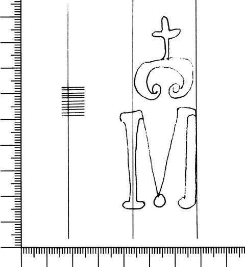 Tipo de filigrana: Sencilla Parte estudiada: Toda la filigrana Código del Motivo: V.01.13.00 Descripción: Letra M surmontada por una cruz. Estructura: Tradicional de líneas Altura (mm): 75 Anchura (mm): 30 Tipo de papel: Verjurado Posición en la hoja: Distancia entre corondeles: Posición en relación al texto: Origen de los datos: Datos obtenidos del original País de localizatión del molino: España Lugar del molino: Rsacafría, Madrid Fabricante: Milino de lso monjes gerónimos del monasterio del Paular Autor de los datos de este registro: María Dolores Díaz de Miranda Macías Estado de la hoja: Cortados todos los bordes Altura de la hoja: 365 Anchura de la hoja: 227 Color de la hoja: Natural Institución: Monasterio de San Pelayo, Oviedo.