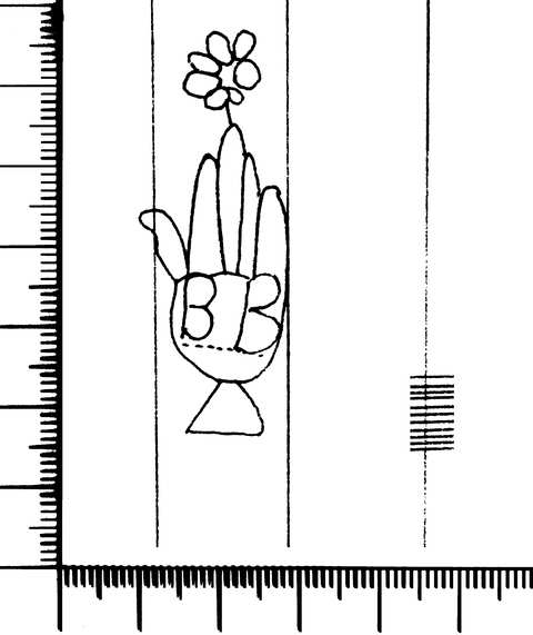 Tipo de filigrana: Sencilla Parte estudiada: Toda la filigrana Código del Motivo: B.05.02.00 Descripción: Mano con los dedos segados por una línea en la palma. Encima flor. En la palma las letras BB. Estructura: Tradicional de líneas Altura (mm): 51 Anchura (mm): 19 Tipo de papel: Verjurado Posición en la hoja: Distancia entre corondeles: Posición en relación al texto: Origen de los datos: Datos obtenidos del original País de localizatión del molino: Francia Autor de los datos de este registro: María Dolores Díaz de Miranda Macías Estado de la hoja: Cortados todos los bordes Altura de la hoja: 304 Anchura de la hoja: 210 Color de la hoja: Natural Institución: Archivo del Monasterio de Santo Domingo de Silos.