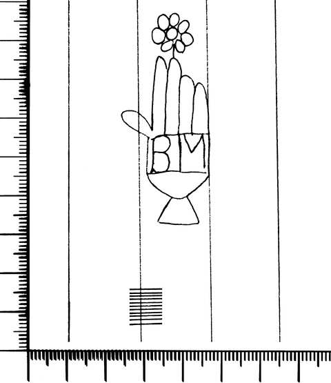 Tipo de filigrana: Sencilla Parte estudiada: Toda la filigrana Código del Motivo: B.05.02.00 Descripción: Mano con los dedos segados por una línea en la palma. Encima flor. En la palma las letras BB. Estructura: Tradicional de líneas Altura (mm): 55 Anchura (mm): 22 Tipo de papel: Verjurado Posición en la hoja: Medio centro Distancia entre corondeles: Posición en relación al texto: Origen de los datos: Datos obtenidos del original País de localizatión del molino: Francia Autor de los datos de este registro: María Dolores Díaz de Miranda Macías Estado de la hoja: Cortados todos los bordes Altura de la hoja: 300 Anchura de la hoja: 206 Color de la hoja: Natural Institución: Archivo del Monasterio de Santo Domingo de Silos.