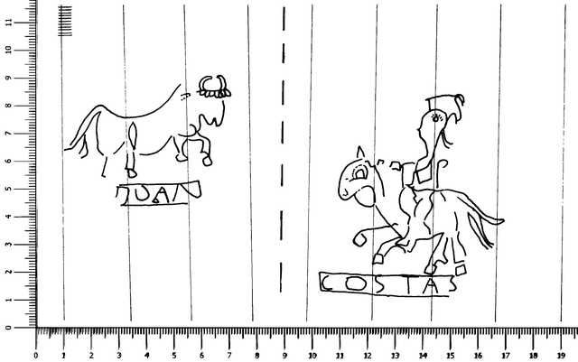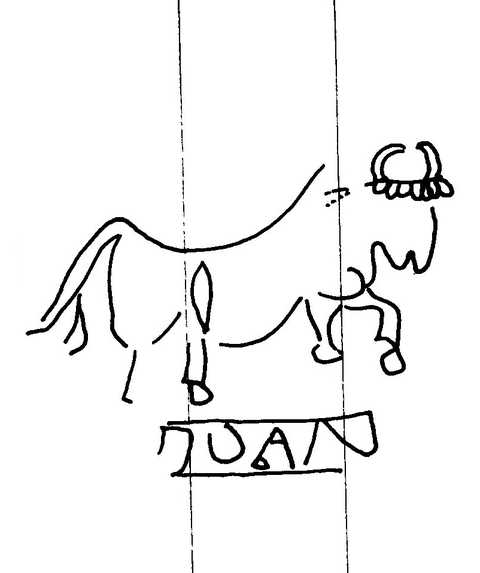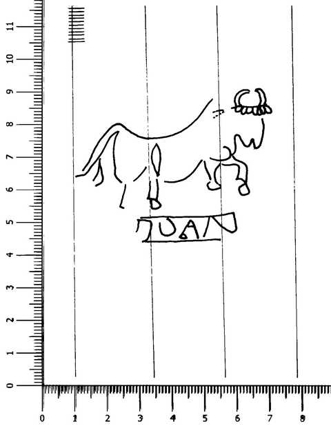 Tipo de filigrana: Doble Parte estudiada: Izquierda Código del Motivo: C.01.01.00 Descripción: Filigrana doble. Filigrana izquierda: Toro, en la base JUAN. Filigrana derecha: Rejoneador, en la base COSTAS. Estructura: Tradicional de líneas Altura (mm): 48 Anchura (mm): 60 Tipo de papel: Verjurado Posición en la hoja: Izquierda centro Nº de corondeles en la hoja: 19 Distancia entre corondeles: Situada entre el corondel 3 y el corondel 6 Posición en relación al texto: Origen de los datos: Datos obtenidos del original País de localizatión del molino: España Lugar del molino: Carme, Comarca de l'Anoia, Barcelona. Nombre del molino: Molino Cal Tort. Fabricante: Joan Costas Tipo de uso: Papel sellado Estado de la hoja: Sin cortar bordes Altura de la hoja: 312 Anchura de la hoja: 430 Color de la hoja: Natural Institución: Archivo Municipal de Oviedo.