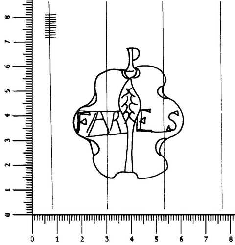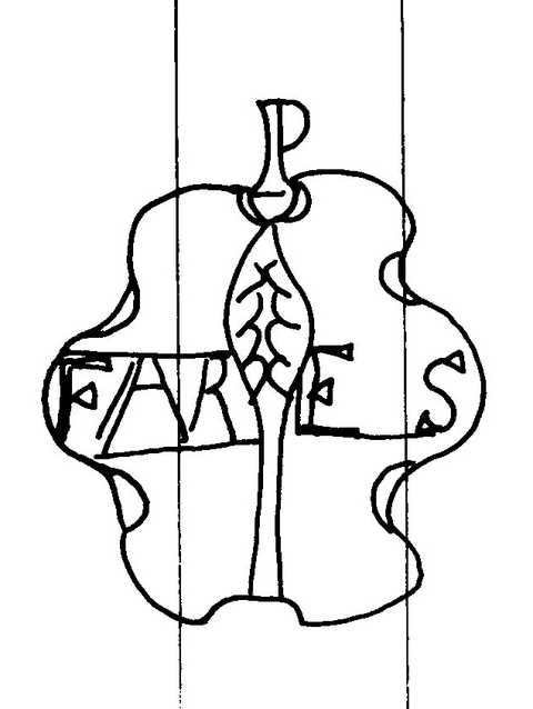 Tipo de filigrana: Sencilla Parte estudiada: Toda la filigrana Código del Motivo: T.02.04.01 Descripción: Escudo surmontado por la inicial P, en el interior un ciprés y FARES. Estructura: Tradicional de líneas Altura (mm): 54 Anchura (mm): 44 Tipo de papel: Verjurado Posición en la hoja: Derecha centro Nº de corondeles en la hoja: 19 Distancia entre corondeles: Situada entre el corondel 14 y el corondel 17 Posición en relación al texto: Origen de los datos: Datos obtenidos del original País de localizatión del molino: España Lugar del molino: Capellades, Barcelona. Fabricante: Pau Ferrer Tipo de uso: Papel sellado Estado de la hoja: Sin cortar bordes Altura de la hoja: 311 Anchura de la hoja: 430 Color de la hoja: Natural Institución: Archivo Municipal de Oviedo.
