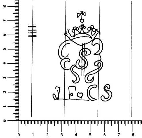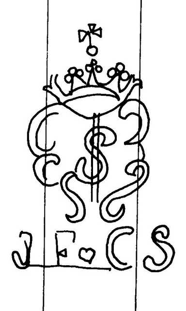 Tipo de filigrana: Sencilla Parte estudiada: Toda la filigrana Código del Motivo: T.02.17.00 Descripción: Escudo con corona; en el interior la inicial S y en la base las letras JF, un pequeño corazón y las letras CS. Estructura: Tradicional de líneas Altura (mm): 64 Anchura (mm): 42 Tipo de papel: Verjurado Posición en la hoja: Derecha centro Nº de corondeles en la hoja: 19 Distancia entre corondeles: Situada entre el corondel 14 y el corondel 17 Posición en relación al texto: Origen de los datos: Datos obtenidos del original País de localizatión del molino: España Lugar del molino: Comarca de l'Anoia, Barcelona. Fabricante: Costas Tipo de uso: Papel sellado Estado de la hoja: Sin cortar bordes Altura de la hoja: 308 Anchura de la hoja: 430 Color de la hoja: Natural Institución: Archivo Municipal de Oviedo.