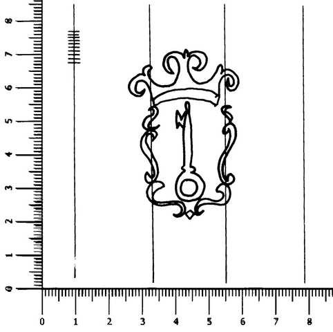 Tipo de filigrana: Sencilla Parte estudiada: Toda la filigrana Código del Motivo: T.02.10.05 Descripción: Escudo con una llave dentro. Estructura: Tradicional de líneas Altura (mm): 51 Anchura (mm): 33 Tipo de papel: Verjurado Posición en la hoja: Izquierda centro Nº de corondeles en la hoja: 19 Distancia entre corondeles: Situada entre el corondel 4 y el corondel 7 Posición en relación al texto: Origen de los datos: Datos obtenidos del original País de localizatión del molino: España Lugar del molino: Capellades, Barcelona. Fabricante: Almirall Tipo de uso: Papel sellado Estado de la hoja: Sin cortar bordes Altura de la hoja: 310 Anchura de la hoja: 430 Color de la hoja: Natural Institución: Archivo Municipal de Oviedo.