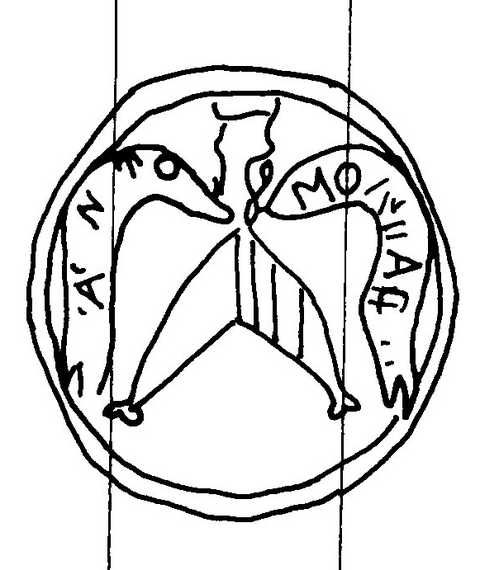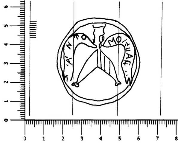 Tipo de filigrana: Sencilla Parte estudiada: Toda la filigrana Código del Motivo: T.02.00.00 Descripción: Círculo orlado; en el interior escudo con divisa: A?NTO MO??A?? Estructura: Tradicional de líneas Altura (mm): 47 Anchura (mm): 44 Tipo de papel: Verjurado Posición en la hoja: Derecha centro Nº de corondeles en la hoja: 19 Distancia entre corondeles: Situada entre el corondel 13 y el corondel 16 Posición en relación al texto: Origen de los datos: Datos obtenidos del original País de localizatión del molino: España Lugar del molino: Onteniente, Valencia Fabricante: Antonio Mora Tipo de uso: Papel sellado Estado de la hoja: Sin cortar bordes Altura de la hoja: 310 Anchura de la hoja: 430 Color de la hoja: Natural Institución: Archivo Municipal de Oviedo.