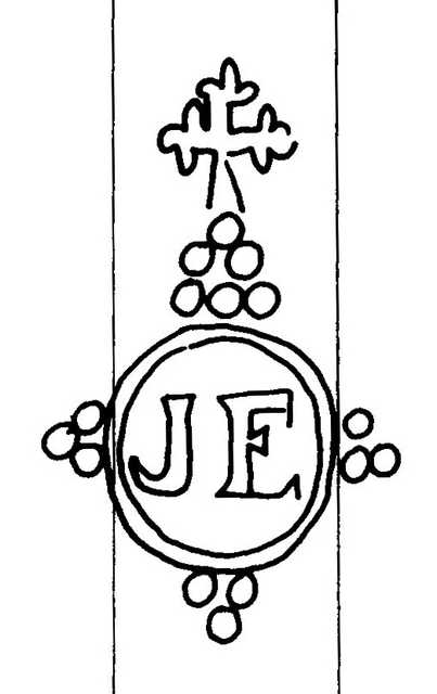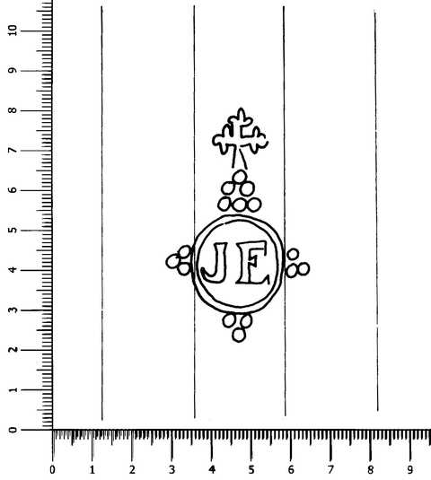 Tipo de filigrana: Doble Parte estudiada: Derecha Código del Motivo: U.01.06.03 Descripción: Filigrana doble. Filigrana izquierda: CATALUNYA. Filigrana derecha: Círculo orlado surmontado por una cruz lobulada, en el interior las iniciales JE. Estructura: Tradicional de líneas Altura (mm): 59 Anchura (mm): 36 Tipo de papel: Verjurado Posición en la hoja: Derecha centro Nº de corondeles en la hoja: 19 Distancia entre corondeles: Situada entre el corondel 13 y el corondel 16 Posición en relación al texto: Origen de los datos: Datos obtenidos del original País de localizatión del molino: España Lugar del molino: Capellades, Barcelona. Fabricante: Jaume Esteve. Tipo de uso: Papel sellado Estado de la hoja: Sin cortar bordes Altura de la hoja: 309 Anchura de la hoja: 430 Color de la hoja: Natural Institución: Archivo Municipal de Oviedo.