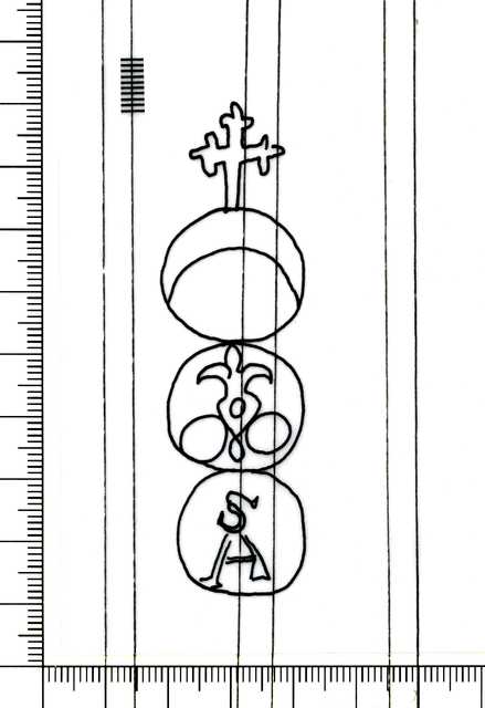 Tipo de filigrana: Sencilla Parte estudiada: Toda la filigrana Código del Motivo: U.03.03.11 Descripción: Tres círculos unidos; sobre el primero, una cruz trebolada; en su interior, una medialuna; en el segundo, dos círculos a los costados de una especie de flor; en el tercero, las letras S / A. Estructura: Tradicional de líneas Altura (mm): 79 Anchura (mm): 23 Tipo de papel: Verjurado Posición en la hoja: Indeterminada Distancia entre corondeles: Posición en relación al texto: Origen de los datos: Datos obtenidos del original País de localizatión del molino: Italia Autor de los datos de este registro: María Dolores Díaz de Miranda Macías Estado de la hoja: Bordes sin determinar Altura de la hoja: Anchura de la hoja: Color de la hoja: Natural Institución: Archivo Municipal de Oviedo.