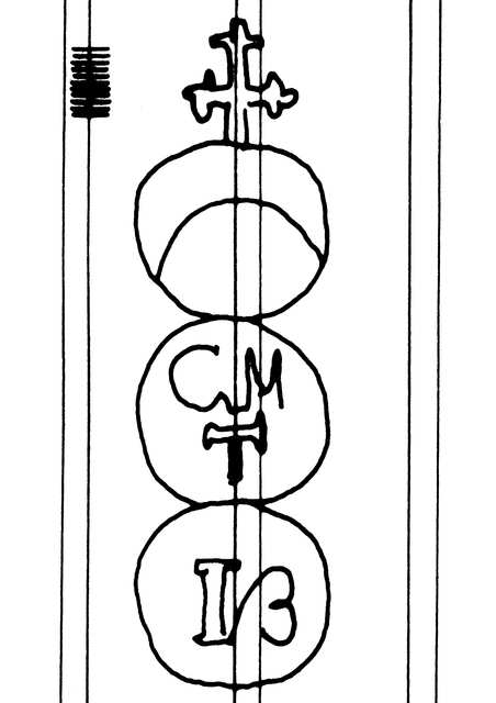 Tipo de filigrana: Sencilla Parte estudiada: Toda la filigrana Código del Motivo: U.03.03.11 Descripción: Tres círculos unidos. Sobre el primero, una cruz trebolada y en el interior, media luna. En el segundo, las letras CM / T. En el tercero, las letras I / B. Estructura: Tradicional de líneas Altura (mm): 89 Anchura (mm): 25 Tipo de papel: Verjurado Posición en la hoja: Derecha centro Nº de corondeles en la hoja: 19 Distancia entre corondeles: Entre 22 y 24 Situada entre el corondel 13 y el corondel 15 Posición en relación al texto: Perpendicular al texto hacia arriba Origen de los datos: Datos obtenidos del original País de localizatión del molino: Italia Estado de la hoja: Cortado borde superior, inferior y derecho Altura de la hoja: 302 Anchura de la hoja: [428] Color de la hoja: Natural Institución: Archivo Municipal de Oviedo.