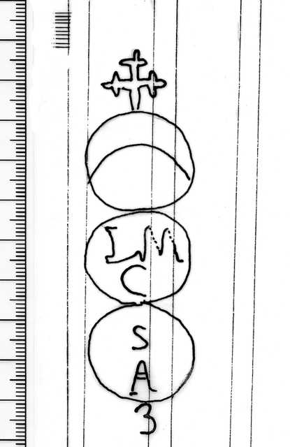 Tipo de filigrana: Doble Parte estudiada: Derecha Código del Motivo: U.03.03.11 Descripción: Filigrana doble. Filigrana izquierda: Águila sin corona. Filigrana derecha: tres círculos unidos; en el primero,encima una cruz trebolada y en el interior una medialuna; el el segundo, LM / C; en el tercero, SA y fuera el número 3. Estructura: Tradicional de líneas Altura (mm): 99 Anchura (mm): Tipo de papel: Verjurado Posición en la hoja: Derecha centro Nº de corondeles en la hoja: 18 Distancia entre corondeles: Entre 22 y 24 Posición en relación al texto: Perpendicular al texto hacia arriba Origen de los datos: Datos obtenidos del original País de localizatión del molino: Italia Estado de la hoja: Cortados todos los bordes Altura de la hoja: 296 Anchura de la hoja: 420 Color de la hoja: Natural Institución: Archivo Municipal de Oviedo.