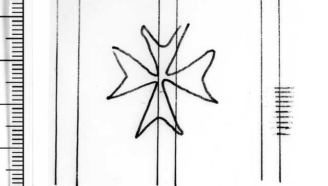 Tipo de filigrana: Doble Parte estudiada: Derecha Código del Motivo: U.03.03.11 Descripción: Filigrana doble. Filigrana izquierda: Cruz de Malta. Filigrana derecha: Tres círculos unidos. Sobre el primero, una cruz trebolada y en el interior, media luna; en el segundo, las letras PP. En el tercero, el número 3. Estructura: Altura (mm): 95 Anchura (mm): 32 Tipo de papel: Verjurado Posición en la hoja: Derecha centro Nº de corondeles en la hoja: 18 Distancia entre corondeles: Entre 24 y 25 Situada entre el corondel 13 y el corondel 15 Posición en relación al texto: Perpendicular al texto hacia abajo Origen de los datos: Datos obtenidos del original País de localizatión del molino: Italia Estado de la hoja: Bordes sin determinar Altura de la hoja: 302 Anchura de la hoja: 427 Color de la hoja: Natural Institución: Archivo Municipal de Oviedo.