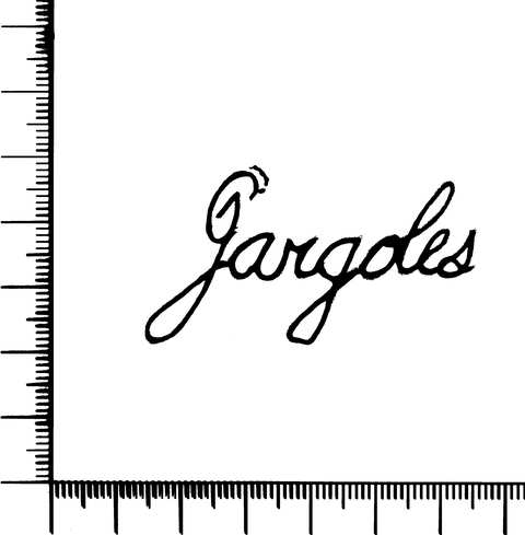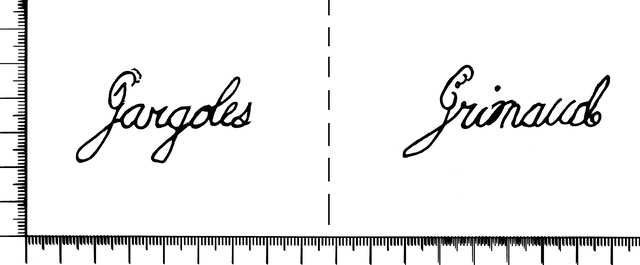 Tipo de filigrana: Doble Parte estudiada: Izquierda Código del Motivo: W.03.00.00 Descripción: Filigrana doble. Filigrana izquierda: topónimo GARGOLES. Filigrana derecha: apellido GRIMAUD. Estructura: Tradicional de líneas Altura (mm): 28 Anchura (mm): 51 Tipo de papel: Posición en la hoja: Izquierda inferior Distancia entre corondeles: Posición en relación al texto: Origen de los datos: Datos obtenidos del original País de localizatión del molino: España Lugar del molino: Gargoles Fabricante: Grimaud Estado de la hoja: Cortados todos los bordes Altura de la hoja: 304 Anchura de la hoja: 426 Color de la hoja: Natural Estado de conservación: Bueno Institución: Particular