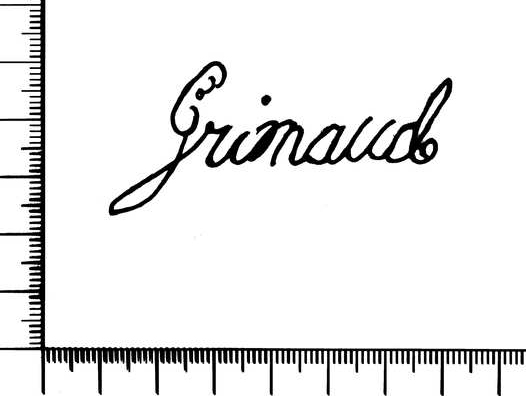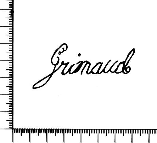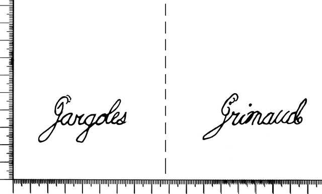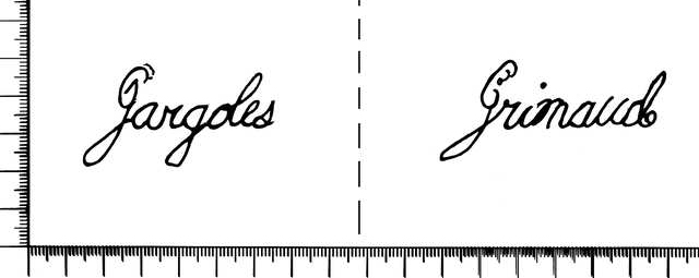 Tipo de filigrana: Doble Parte estudiada: Derecha Código del Motivo: W.02.01.00 Descripción: Filigrana doble. Filigrana izquierda: topónimo GARGOLES. Filigrana derecha: apellido GRIMAUD. Estructura: Tradicional de líneas Altura (mm): 28 Anchura (mm): 61 Tipo de papel: Posición en la hoja: Derecha inferior Distancia entre corondeles: Posición en relación al texto: Origen de los datos: Datos obtenidos del original País de localizatión del molino: España Lugar del molino: Gargoles Fabricante: Grimaud Estado de la hoja: Cortados todos los bordes Altura de la hoja: 304 Anchura de la hoja: 426 Color de la hoja: Natural Estado de conservación: Bueno Institución: Particular.