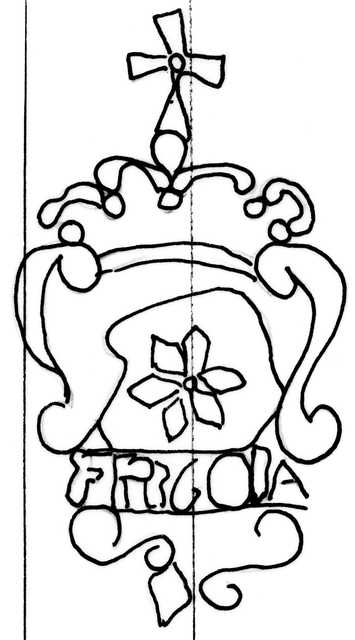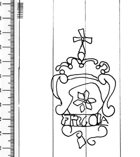 Tipo de filigrana: Sencilla Parte estudiada: Toda la filigrana Código del Motivo: T.02.04.03 Descripción: Flor dentro de un escudo y cartela: FRIGOLA. Estructura: Tradicional de líneas Altura (mm): 83 Anchura (mm): 45 Tipo de papel: Posición en la hoja: Derecha centro Nº de corondeles en la hoja: 18 Distancia entre corondeles: Situada entre el corondel 12 y el corondel 15 Posición en relación al texto: Perpendicular al texto hacia arriba Origen de los datos: Datos obtenidos del original Fabricante: Frigola. Estado de la hoja: Cortados todos los bordes Altura de la hoja: 294 Anchura de la hoja: Color de la hoja: Natural Estado de conservación: Restaurado Institución: Museo de Historia de Cataluña.
