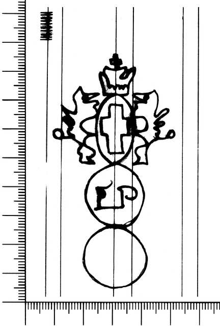 Tipo de filigrana: Sencilla Parte estudiada: Toda la filigrana Código del Motivo: U.02.02.07 Descripción: Dos círculos unidos. Sobre el primero, el escudo de Génova y en el interior, las letras F P. Estructura: Tradicional de líneas Altura (mm): 81 Anchura (mm): 42 Tipo de papel: 9 Posición en la hoja: Medio centro Distancia entre corondeles: Situada entre el corondel 3 y el corondel 5 Posición en relación al texto: Perpendicular al texto hacia arriba Origen de los datos: Datos obtenidos del original Información adicional: A la izquierda de la filigrana tiene tres corondeles dobles y la mitad de otro. País de localizatión del molino: Italia Autor de los datos de este registro: María Dolores Díaz de Miranda Macías Estado de la hoja: Bordes sin determinar Altura de la hoja: 300 Anchura de la hoja: 205 Color de la hoja: Natural Estado de conservación: Bueno pH del papel: Verjurado Institución: Acuerdos A-46.