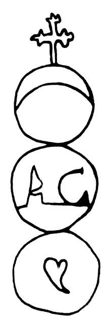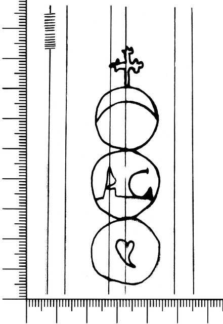 Tipo de filigrana: Sencilla Parte estudiada: Toda la filigrana Código del Motivo: U.03.03.09 Descripción: Tres círculos unidos. Sobre el primero, una cruz trebolada y en el interior una medialuna. En el segundo, las letras A C. En el tercero, un corazón. Estructura: Tradicional de líneas Altura (mm): 80 Anchura (mm): 22 Tipo de papel: 10 Posición en la hoja: Medio centro Distancia entre corondeles: Situada entre el corondel 4 y el corondel 6 Posición en relación al texto: Perpendicular al texto hacia abajo Origen de los datos: Datos obtenidos del original País de localizatión del molino: Italia Autor de los datos de este registro: María Dolores Díaz de Miranda Macías Estado de la hoja: Bordes sin determinar Altura de la hoja: 296 Anchura de la hoja: 205 Color de la hoja: Natural Estado de conservación: Bueno pH del papel: Verjurado Institución: Acuerdos A-46.