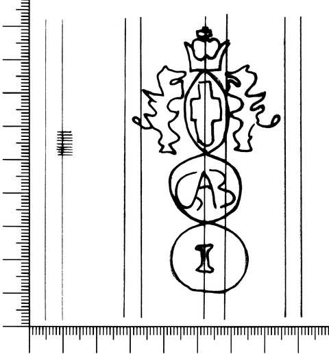 Tipo de filigrana: Sencilla Parte estudiada: Toda la filigrana Código del Motivo: U.02.02.07 Descripción: Dos círculos unidos. Sobre el primero, el escudo de Génova y en el interior, las letras CAB. En el segundo, la letra I. Estructura: Tradicional de líneas Altura (mm): 80 Anchura (mm): 44 Tipo de papel: 9 Posición en la hoja: Medio centro Distancia entre corondeles: Situada entre el corondel 4 y el corondel 7 Posición en relación al texto: Perpendicular al texto hacia arriba Origen de los datos: Datos obtenidos del original Información adicional: A la izquierda de la filigrana tiene cuatro corondeles dobles y la mitad de otro. País de localizatión del molino: Italia Autor de los datos de este registro: María Dolores Díaz de Miranda Macías Estado de la hoja: Bordes sin determinar Altura de la hoja: 299 Anchura de la hoja: 205 Color de la hoja: Natural Estado de conservación: Bueno pH del papel: Verjurado Institución: Acuerdos A-46.