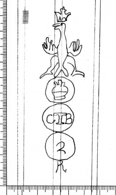 Tipo de filigrana: Sencilla Parte estudiada: Toda la filigrana Código del Motivo: U.03.03.04 Descripción: Tres círculos. Sobre el primero, un águila coronada y en el interior, un recipiente para beber. En el segundo, las letras CTB. En el tercero, el número 2 y debajo, la letra R. Estructura: Tradicional de líneas Altura (mm): 109 Anchura (mm): 29 Tipo de papel: Verjurado Posición en la hoja: Medio centro Nº de corondeles en la hoja: 9 Distancia entre corondeles: Media entre 18 y 21 Situada entre el corondel 4 y el corondel 6 Posición en relación al texto: Perpendicular al texto hacia arriba Origen de los datos: Datos obtenidos del original País de localizatión del molino: Italia Estado de la hoja: Bordes sin determinar Altura de la hoja: 299 Anchura de la hoja: 205 Color de la hoja: Natural Estado de conservación: Bueno Institución: Archivo Municipal de Oviedo.