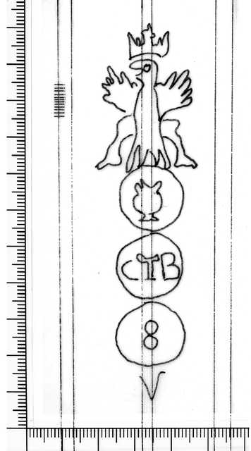 Tipo de filigrana: Sencilla Parte estudiada: Toda la filigrana Código del Motivo: U.03.03.04 Descripción: Tres círculos. Sobre el primero, un águila coronada y en el interior, un recipiente para beber. En el segundo, las letras CTB. En el tercero, el número 8 y debajo, la letra V. Estructura: Tradicional de líneas Altura (mm): 105 Anchura (mm): 28 Tipo de papel: Verjurado Posición en la hoja: Medio centro Nº de corondeles en la hoja: 9 Distancia entre corondeles: Media entre 16 y 18 Situada entre el corondel 5 y el corondel 7 Posición en relación al texto: Perpendicular al texto hacia arriba Origen de los datos: Datos obtenidos del original País de localizatión del molino: Italia Estado de la hoja: Bordes sin determinar Altura de la hoja: 299 Anchura de la hoja: 205 Color de la hoja: Natural Estado de conservación: Bueno Institución: Archivo Municipal de Oviedo.