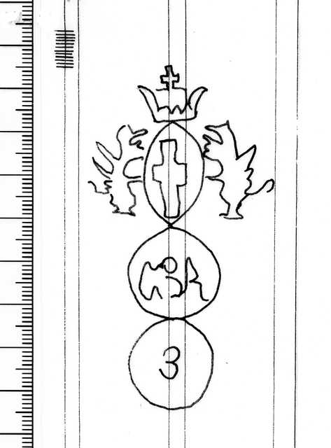 Tipo de filigrana: Sencilla Parte estudiada: Toda la filigrana Código del Motivo: U.02.02.07 Descripción: Dos círculos unidos. Sobre el primero, el escudo de Génova y en el interior, las letras CBA. En el segundo, el número 3. Estructura: Tradicional de líneas Altura (mm): 80 Anchura (mm): 44 Tipo de papel: Verjurado Posición en la hoja: Medio centro Nº de corondeles en la hoja: 8 Distancia entre corondeles: Media entre 18 y 20 Situada entre el corondel 4 y el corondel 6 Posición en relación al texto: Perpendicular al texto hacia arriba Origen de los datos: Datos obtenidos del original Información adicional: A la izquierda de la filigrana tiene cuatro corondeles dobles y la mitad de otro. País de localizatión del molino: Italia Estado de la hoja: Bordes sin determinar Altura de la hoja: 296 Anchura de la hoja: 205 Color de la hoja: Natural Estado de conservación: Bueno Institución: Archivo Municipal de Oviedo.