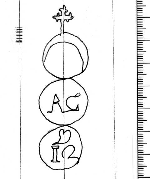 Tipo de filigrana: Sencilla Parte estudiada: Toda la filigrana Código del Motivo: U.03.03.11 Descripción: Tres círculos unidos. Sobre el primero, una cruz trebolada y en el interior una medialuna. En el segundo, las letras AG. En el tercero, corazón / I3. Estructura: Tradicional de líneas Altura (mm): 73 Anchura (mm): 21 Tipo de papel: Verjurado Posición en la hoja: Medio centro Nº de corondeles en la hoja: 10 Distancia entre corondeles: Media entre 19 y 21 Situada entre el corondel 5 y el corondel 7 Posición en relación al texto: Perpendicular al texto hacia abajo Origen de los datos: Datos obtenidos del original País de localizatión del molino: Italia Estado de la hoja: Bordes sin determinar Altura de la hoja: 299 Anchura de la hoja: 206 Color de la hoja: Natural Estado de conservación: Bueno Institución: Archivo Municipal de Oviedo.