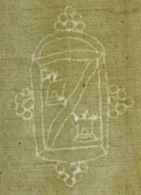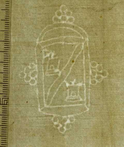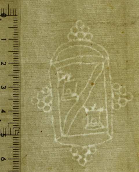 Tipo de filigrana: Sencilla Parte estudiada: Toda la filigrana Código del Motivo: T.02.11.99 Descripción: Escudo. En el interior, tajado con dos campanas. Estructura: Tradicional de líneas Altura (mm): 61 Anchura (mm): 43 Tipo de papel: Verjurado Posición en la hoja: Derecha centro Nº de corondeles en la hoja: 19 Distancia entre corondeles: Situada entre el corondel 14 y el corondel 16 Posición en relación al texto: Origen de los datos: Lugar del molino: Cataluña Estado de la hoja: Cortados todos los bordes Altura de la hoja: 295 Anchura de la hoja: 414 Color de la hoja: Natural Institución: Parroquia de Sitges. Arquelisbat de Barcelona.