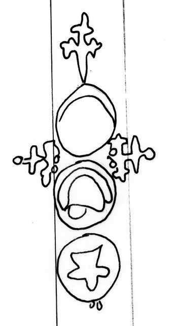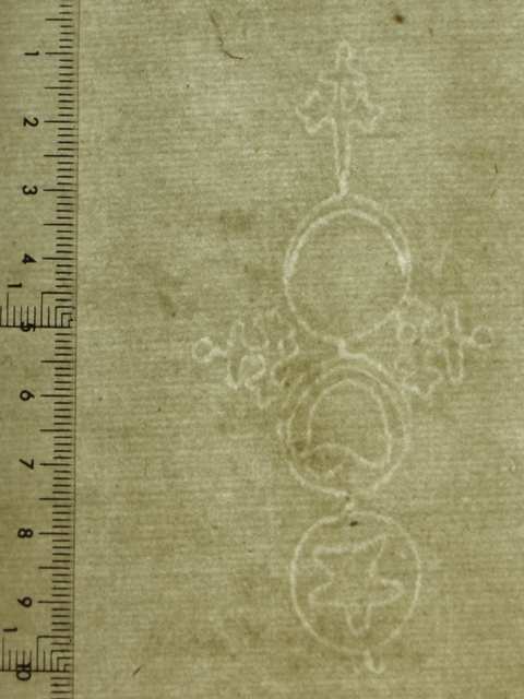 Tipo de filigrana: Sencilla Parte estudiada: Toda la filigrana Código del Motivo: U.03.03.11 Descripción: Tres círculos. Con cruz trebolada sobre el primero y en el interior, medialuna. Estructura: Tradicional de líneas Altura (mm): 94 Anchura (mm): 44 Tipo de papel: Verjurado Posición en la hoja: Medio centro Nº de corondeles en la hoja: 9 Distancia entre corondeles: Situada entre el corondel 3 y el corondel 6 Posición en relación al texto: Origen de los datos: Estado de la hoja: Cortados todos los bordes Altura de la hoja: 310 Anchura de la hoja: 218 Color de la hoja: Natural Institución: Escola Pía de Catalunya. Archivo provincial.