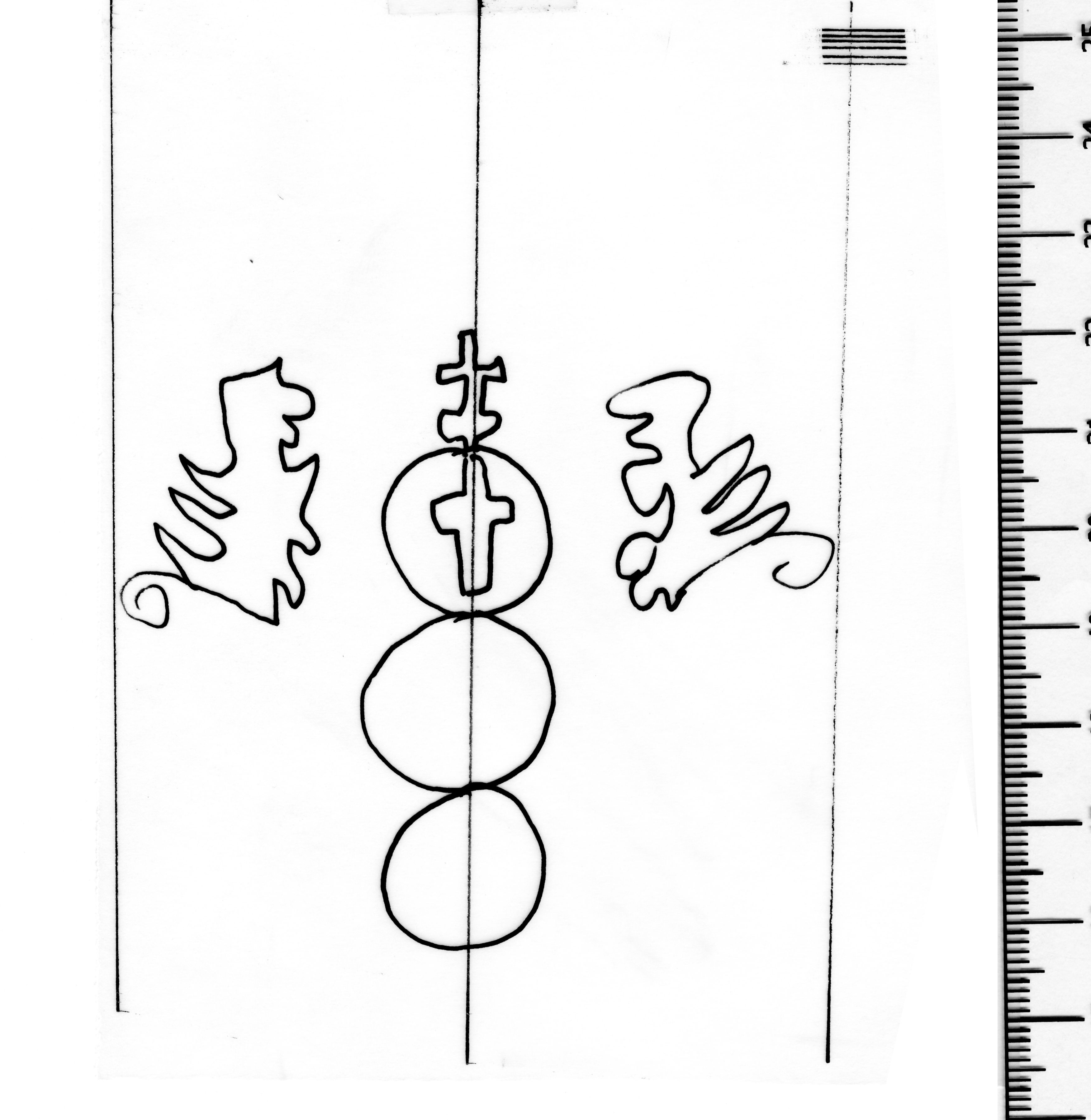 Tipo de filigrana: Sencilla Parte estudiada: Toda la filigrana Código del Motivo: U.03.03.12 Descripción: Tres círculos surmontados por una cruz lobulada, a los lados dos grifos, en el interior del círculo superior un cruz Estructura: Tradicional de líneas Altura (mm): 63 Anchura (mm): 73 Tipo de papel: Verjurado Posición en la hoja: Medio centro Distancia entre corondeles: Posición en relación al texto: Origen de los datos: Datos obtenidos del original País de localizatión del molino: Francia Estado de la hoja: Cortados todos los bordes Altura de la hoja: 310 Anchura de la hoja: 214 Color de la hoja: Natural Institución: Archiuvo Municipal de Oviedo