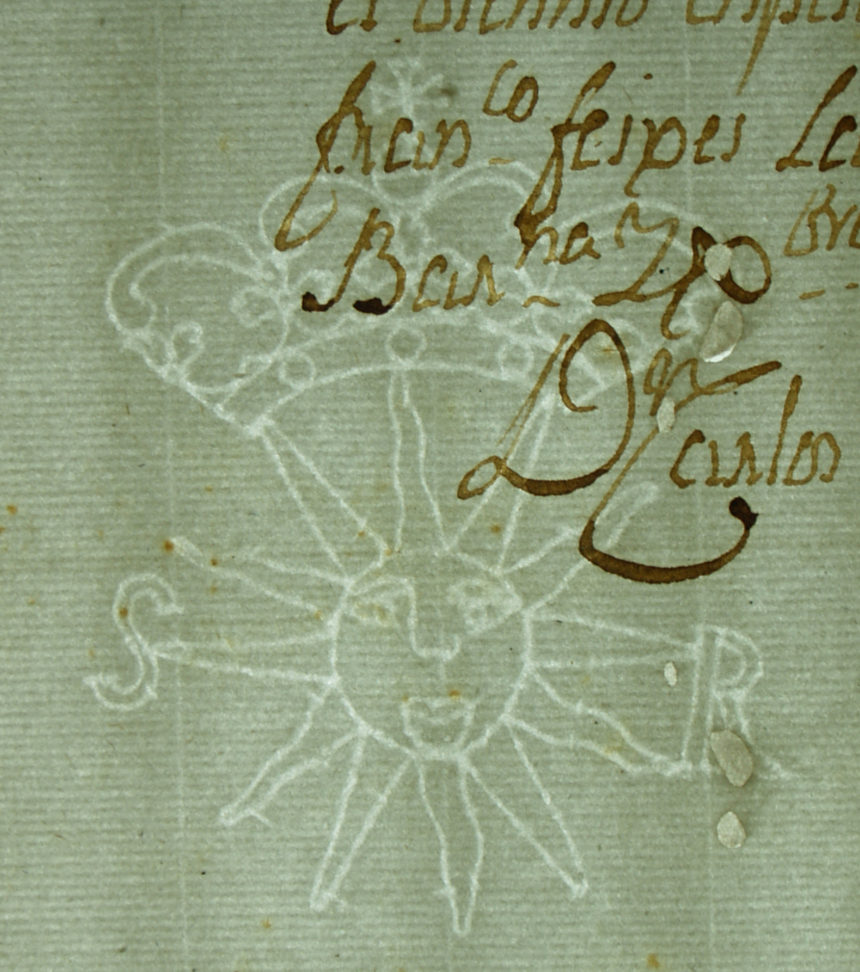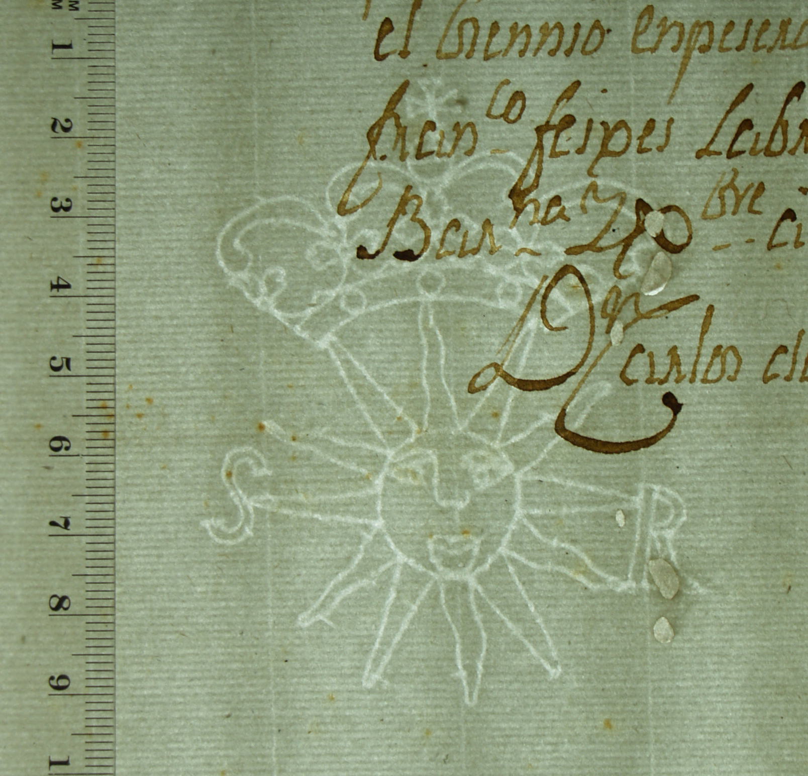 Tipo de filigrana: Sencilla Parte estudiada: Toda la filigrana Código del Motivo: J.01.01.02 Descripción: Sol con rostro y corona. A los lados letras: SR Estructura: Tradicional de líneas Altura (mm): 80 Anchura (mm): 64 Tipo de papel: Verjurado Posición en la hoja: Medio centro Nº de corondeles en la hoja: 9 Distancia entre corondeles: Situada entre el corondel 2 y el corondel 6 Posición en relación al texto: Origen de los datos: Datos obtenidos del original Lugar del molino: San Quinti de Mediola (Alt Penedès), Barcelona, Cataluña Fabricante: Vía Estado de la hoja: Cortados todos los bordes Altura de la hoja: 295 Anchura de la hoja: 206 Color de la hoja: Natural Estado de conservación: Restaurado Institución: Particular (Sergi Gascó)