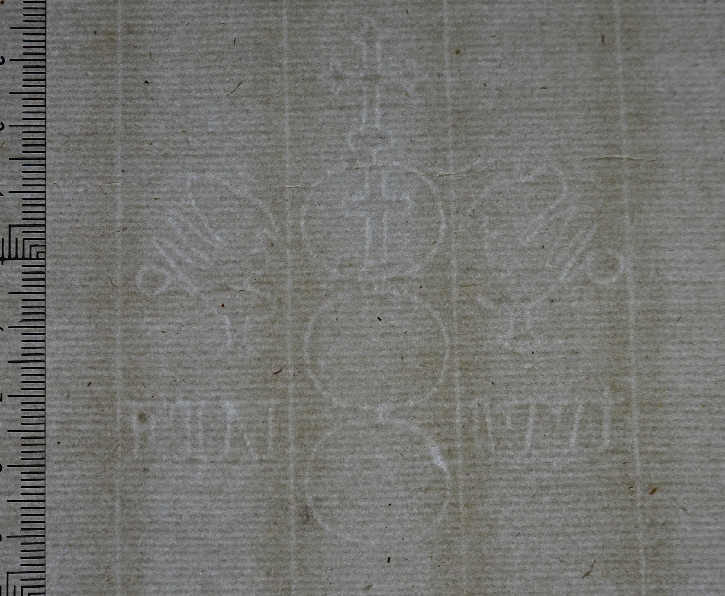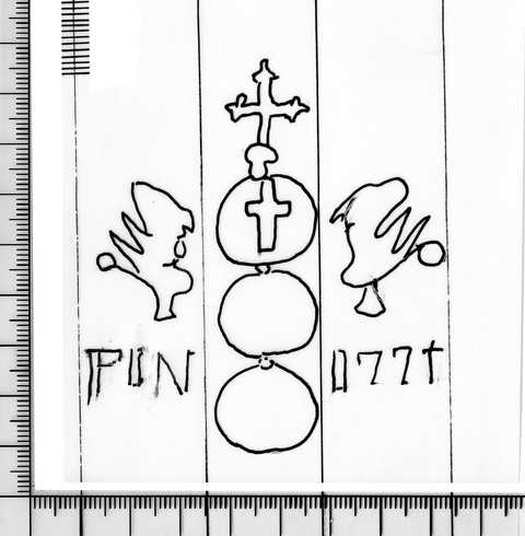 Tipo de filigrana: Sencilla Parte estudiada: Toda la filigrana Código del Motivo: U.03.03.12 Descripción: Tres círculos surmontados por una cruz lobulada, a los lados dos grifos, debajo de ellos FIN 1771, en el interior del círculo superior un cruz. Estructura: Tradicional de líneas Altura (mm): 77 Anchura (mm): 73 Tipo de papel: Verjurado Posición en la hoja: Medio centro Nº de corondeles en la hoja: 8 Distancia entre corondeles: Situada entre el corondel 3 y el corondel 6 Posición en relación al texto: Origen de los datos: Datos obtenidos del original País de localizatión del molino: Francia Lugar del molino: Sur de Francia Estado de la hoja: Cortados todos los bordes Altura de la hoja: 285 Anchura de la hoja: 203 Color de la hoja: Natural Estado de conservación: Bueno Institución: Colección Díaz de Miranda