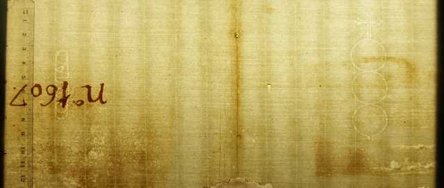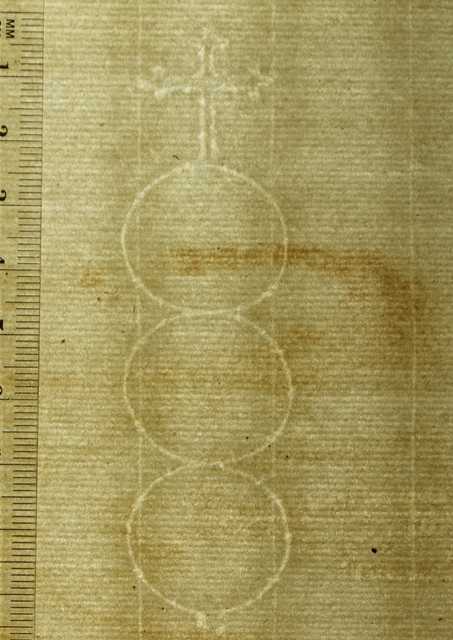 Tipo de filigrana: Doble Parte estudiada: Derecha Código del Motivo: U.03.03.10 Descripción: Filigrana doble. Filigrana izquierda: el apellido: GAVIAO dentro de una cartela. Filigrana derecha: tres círculos, encima una cruz lobulada. Estructura: Tradicional de líneas Altura (mm): 93 Anchura (mm): 26 Tipo de papel: Verjurado Posición en la hoja: Filigrana doble Nº de corondeles en la hoja: 21 Distancia entre corondeles: Situada entre el corondel 14 y el corondel 17 Posición en relación al texto: Origen de los datos: Estado de la hoja: Sin cortar bordes Altura de la hoja: 310 Anchura de la hoja: 425 Color de la hoja: Natural Institución: Archivo Ducal de Medinaceli -ADM-, Toledo