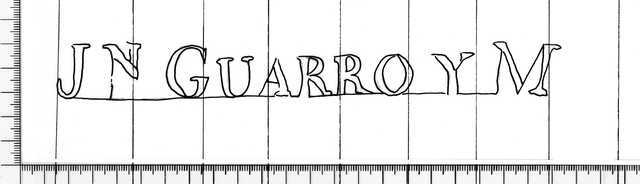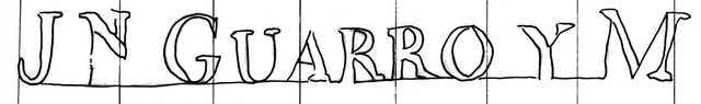 Tipo de filigrana: Sencilla Parte estudiada: Izquierda Código del Motivo: W.04.02.00 Descripción: Filigrana doble. Filigran izquierda: JN GUARRO Y M. Filigrana derecha: torre con más de una torreta y con banderola. Estructura: Tradicional de líneas Altura (mm): 24 Anchura (mm): 207 Tipo de papel: Verjurado Posición en la hoja: Filigrana doble Nº de corondeles en la hoja: 20 Distancia entre corondeles: Situada entre el corondel 3 y el corondel 11 Posición en relación al texto: Origen de los datos: Lugar del molino: La Torra de Claramunt, Cataluña Fabricante: Juan Guarro y M. Estado de la hoja: Bordes sin determinar Altura de la hoja: 417 Anchura de la hoja: 564 Color de la hoja: Natural pH del papel: 6,5 Institución: Archivo del Monasterio de Sant Pere de les Puel·les -AMSP-, Barc