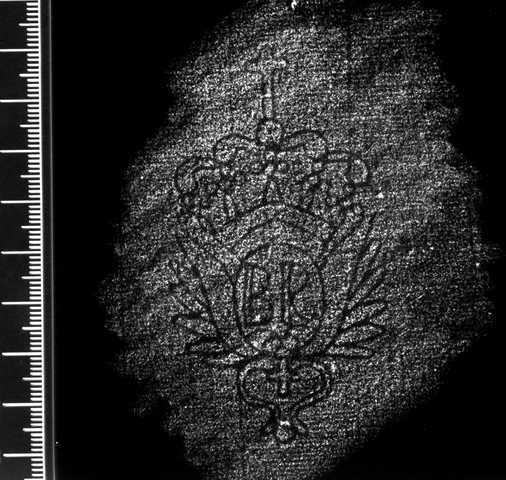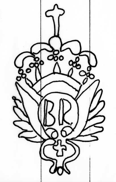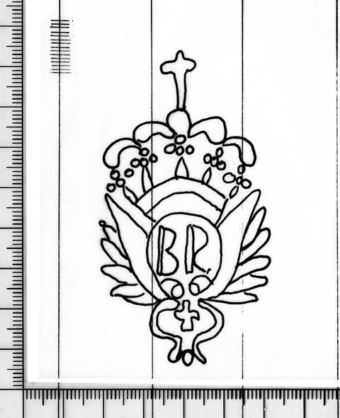 Tipo de filigrana: Sencilla Parte estudiada: Toda la filigrana Código del Motivo: T.02.17.00 Descripción: Emblema heraldico. Encima corona, en el interior las letras BR, a cada lado una ala, debajo una pequeña cruz Estructura: Tradicional de líneas Altura (mm): 79 Anchura (mm): 43 Tipo de papel: Verjurado Posición en la hoja: Medio centro Nº de corondeles en la hoja: 9 Distancia entre corondeles: Situada entre el corondel 3 y el corondel 6 Posición en relación al texto: Origen de los datos: Datos obtenidos del original País de localizatión del molino: España Lugar del molino: Cataluña ? Fabricante: BR Estado de la hoja: Cortados todos los bordes Altura de la hoja: 250-248 Anchura de la hoja: 196 Color de la hoja: Natural Institución: Colección Díaz de Miranda