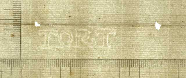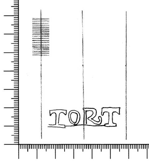 Tipo de filigrana: Sencilla Parte estudiada: Toda la filigrana Código del Motivo: W.02.01.00 Descripción: Letras TORT. Estructura: Tradicional de líneas Altura (mm): 11 Anchura (mm): 38 Tipo de papel: Verjurado Posición en la hoja: Izquierda centro Nº de corondeles en la hoja: 8 Distancia entre corondeles: Situada entre el corondel 3 y el corondel 5 Posición en relación al texto: Paralelo al texto en sentido contrario Origen de los datos: Datos obtenidos del original Tipo de uso: Papel para escribir Estado de la hoja: Cortados todos los bordes Altura de la hoja: 185 Anchura de la hoja: 278 Color de la hoja: Natural Institución: Biblioteca Pública Lambert Mata de Ripoll