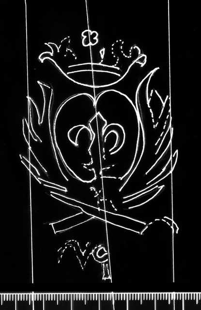 Tipo de filigrana: Doble Parte estudiada: Izquierda Código del Motivo: T.01.09.01 Descripción: Filigrana doble. Filigrana izquierda: Escudo coronado, en el interior flor de lis. Debajo letras no identificadas. Filigrana drecha: cruz de malta. Debajo letra C (invertida) Estructura: Tradicional de líneas Altura (mm): 75 Anchura (mm): 58 Tipo de papel: Verjurado Posición en la hoja: Izquierda centro Nº de corondeles en la hoja: 17 Distancia entre corondeles: Situada entre el corondel 2 y el corondel 6 Posición en relación al texto: Origen de los datos: Estado de la hoja: Cortados todos los bordes Altura de la hoja: 314 Anchura de la hoja: 426 Color de la hoja: Natural Institución: Privado (Manuel Iñiguez Ruiz-Clavijo)