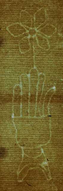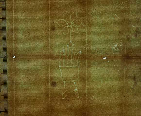 Tipo de filigrana: Sencilla Parte estudiada: Toda la filigrana Código del Motivo: B.05.00.00 Descripción: Mano con los dedos separados por una línea en la palma. Encima una flor de seis pétalos Estructura: Tradicional de líneas Altura (mm): 79 Anchura (mm): 21 Tipo de papel: Verjurado Posición en la hoja: Izquierda centro Nº de corondeles en la hoja: 14 Distancia entre corondeles: Situada entre el corondel 3 y el corondel 4 Posición en relación al texto: Origen de los datos: Datos obtenidos del original Información adicional: Gemela de la R-002410 Estado de la hoja: Sin cortar bordes Altura de la hoja: 307 Anchura de la hoja: 435 Color de la hoja: Natural Estado de conservación: Malo Institución: Archivo Ducal de Medinaceli -ADM-