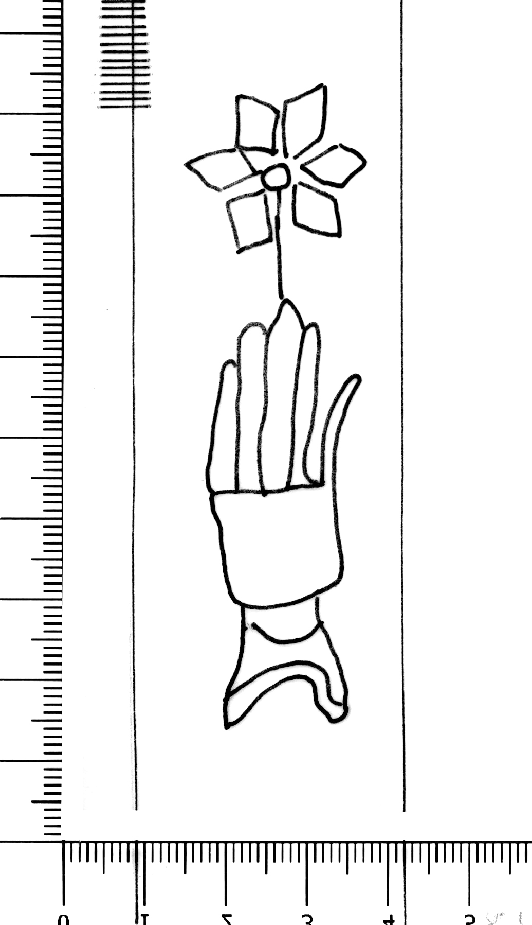 Tipo de filigrana: Sencilla Parte estudiada: Toda la filigrana Código del Motivo: B.05.02.00 Descripción: Mano con los dedos separados por una línea en la palma. Encima una flor de seis pétalos Estructura: Tradicional de líneas Altura (mm): 80 Anchura (mm): 22 Tipo de papel: Verjurado Posición en la hoja: Derecha centro Nº de corondeles en la hoja: 14 Distancia entre corondeles: Situada entre el corondel 11 y el corondel 12 Posición en relación al texto: Origen de los datos: Datos obtenidos del original Información adicional: Gemela de la R-002409 Estado de la hoja: Sin cortar bordes Altura de la hoja: 307 Anchura de la hoja: 435 Color de la hoja: Natural Estado de conservación: Malo Institución: Archivo Ducal de Medinaceli -ADM-