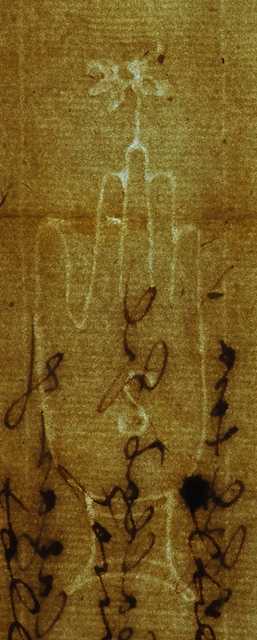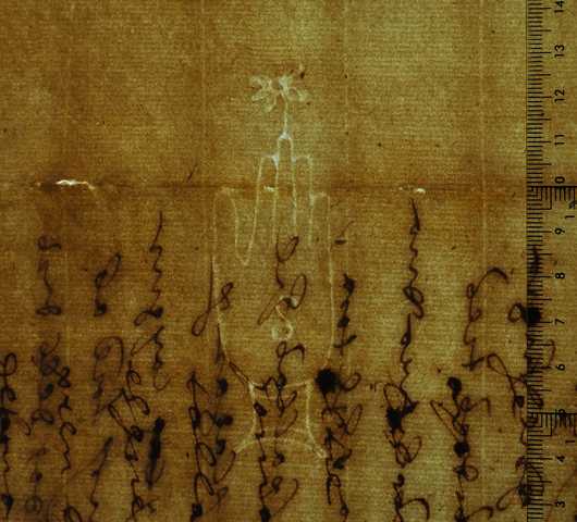 Tipo de filigrana: Sencilla Parte estudiada: Toda la filigrana Código del Motivo: B.02.04.02 Descripción: Mano con cuatro dedos juntos y el pulgar separado. Encima una flor y dentro la letra S Estructura: Tradicional de líneas Altura (mm): 90 Anchura (mm): 27 Tipo de papel: Verjurado Posición en la hoja: Izquierda centro Nº de corondeles en la hoja: 15 Distancia entre corondeles: Situada entre el corondel 4 y el corondel 5 Posición en relación al texto: Origen de los datos: Datos obtenidos del original Estado de la hoja: Sin cortar bordes Altura de la hoja: 312 Anchura de la hoja: 435 Color de la hoja: Natural Estado de conservación: Regular Institución: Archivo Ducal de Medinaceli -ADM-