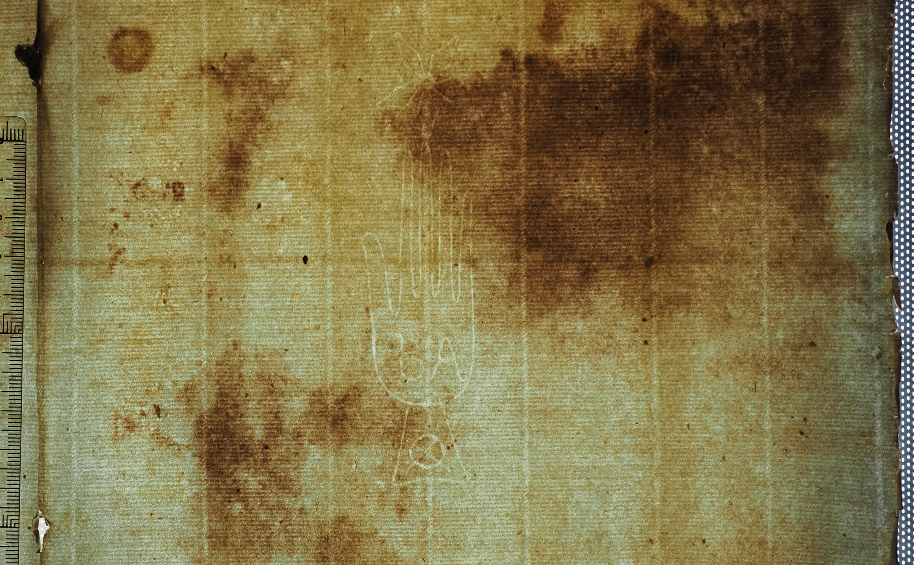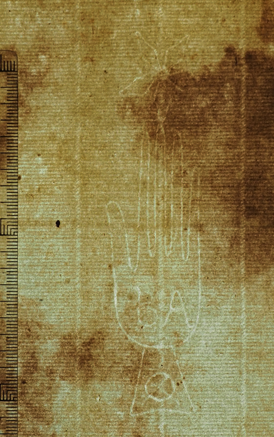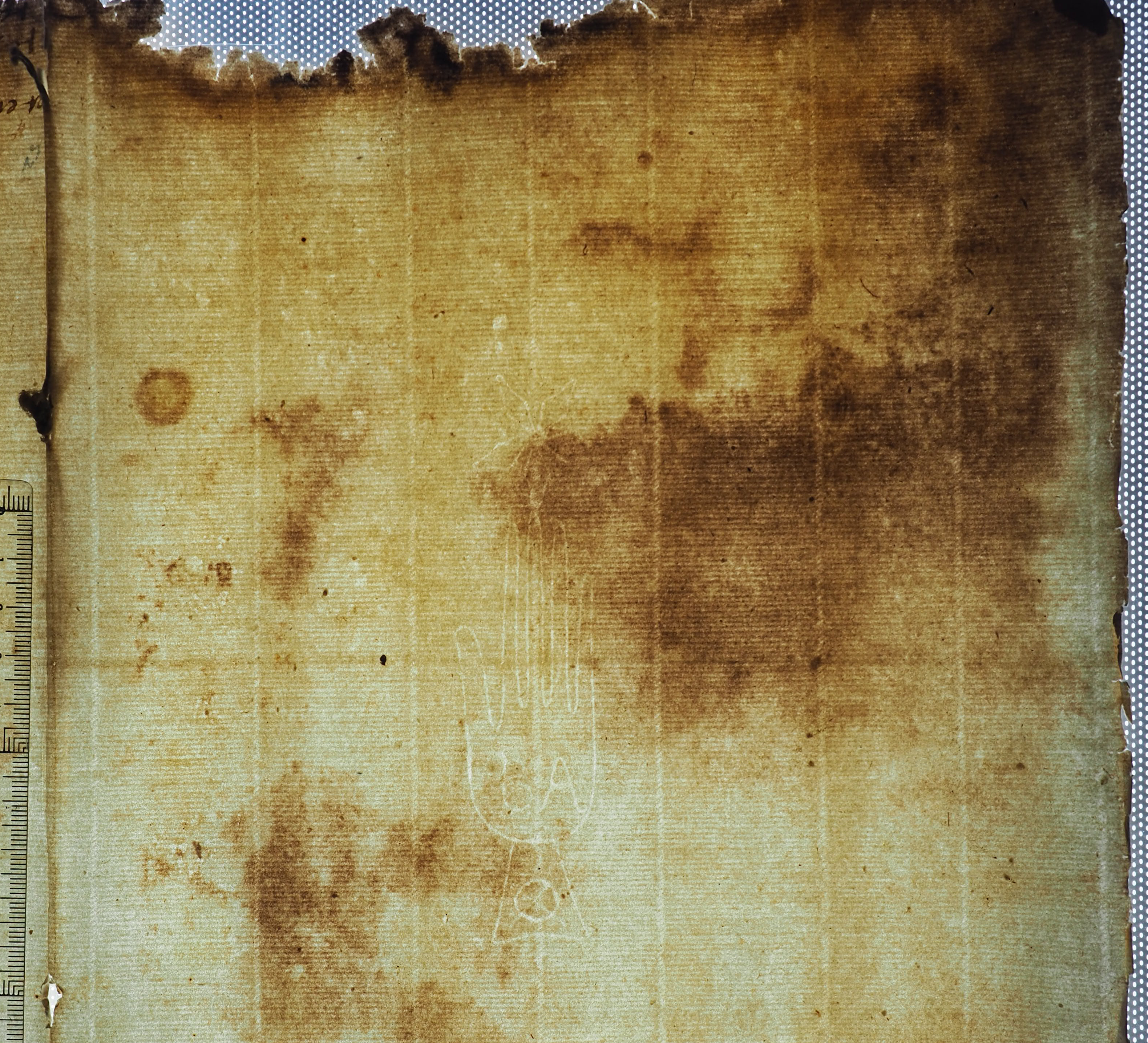 Tipo de filigrana: Sencilla Parte estudiada: Toda la filigrana Código del Motivo: B.01.07.00 Descripción: Mano de grandes dimensiones con los cinco dedos separados. Encima flor de cinco punta. En la palma letras: BA. En el manguito uu círculo con un aspa Estructura: Tradicional de líneas Altura (mm): 114 Anchura (mm): 28 Tipo de papel: Verjurado Posición en la hoja: Izquierda centro Nº de corondeles en la hoja: 15 Distancia entre corondeles: Situada entre el corondel 10 y el corondel 12 Posición en relación al texto: Perpendicular al texto hacia abajo Origen de los datos: Datos obtenidos del original Autor de los datos de este registro: María Dolores Díaz de Miranda Macías Estado de la hoja: Cortados todos los bordes Altura de la hoja: [312] Anchura de la hoja: 431 Color de la hoja: Natural Estado de conservación: Malo Institución: Archivo Ducal de Medinaceli -ADM-
