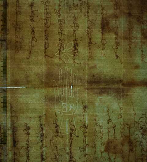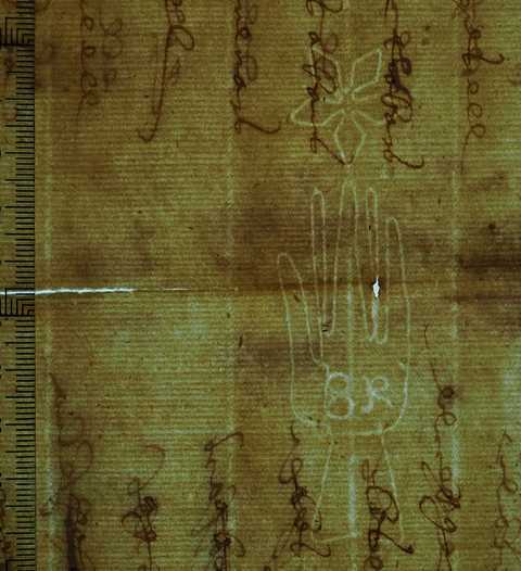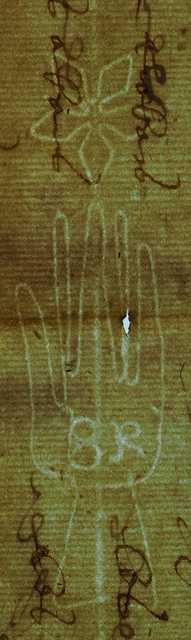 Tipo de filigrana: Sencilla Parte estudiada: Toda la filigrana Código del Motivo: B.01.07.00 Descripción: Mano de grandes dimensiones con los dedos separados. Encima flor de seis puntas y en el interior letras: BR Estructura: Tradicional de líneas Altura (mm): 92 Anchura (mm): 24 Tipo de papel: Posición en la hoja: Izquierda centro Nº de corondeles en la hoja: 7 Distancia entre corondeles: Situada entre el corondel 4 y el corondel 6 Posición en relación al texto: Origen de los datos: Datos obtenidos del original Estado de la hoja: Cortado borde derecho e inferior Altura de la hoja: 317 Anchura de la hoja: 219 Color de la hoja: Natural Estado de conservación: Regular Institución: Archivo Ducal de Medinaceli -ADM-