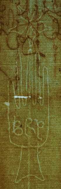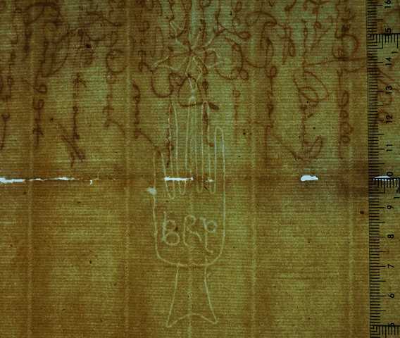 Tipo de filigrana: Sencilla Parte estudiada: Toda la filigrana Código del Motivo: B.02.04.02 Descripción: Mano de grandes dimensiones con los dedos separados. Encima flor de seis puntas y en el interior letras: BRP Estructura: Tradicional de líneas Altura (mm): 107 Anchura (mm): 27 Tipo de papel: Verjurado Posición en la hoja: Medio centro Nº de corondeles en la hoja: 15 Distancia entre corondeles: Situada entre el corondel 4 y el corondel 6 Posición en relación al texto: Origen de los datos: Datos obtenidos del original Estado de la hoja: Sin cortar bordes Altura de la hoja: 320 Anchura de la hoja: 445 Color de la hoja: Natural Estado de conservación: Regular Institución: Archivo Ducal de Medinaceli -ADM-